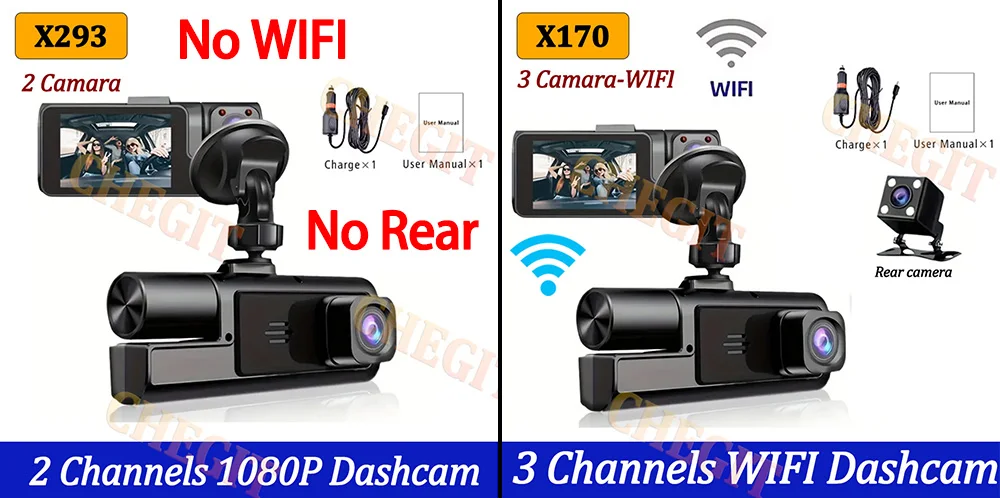 Please note we offer two models with identical appearances but differing configurations: X293: No WiFi, rear camera with optional 2/3 lens X170: WiFi enabled, 3 lenses with rear camera
