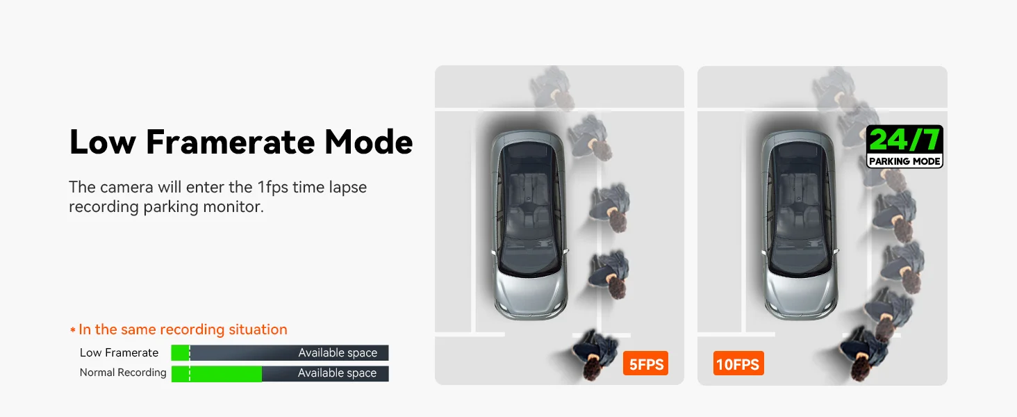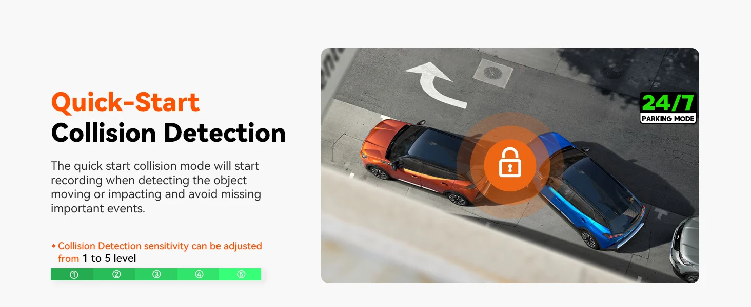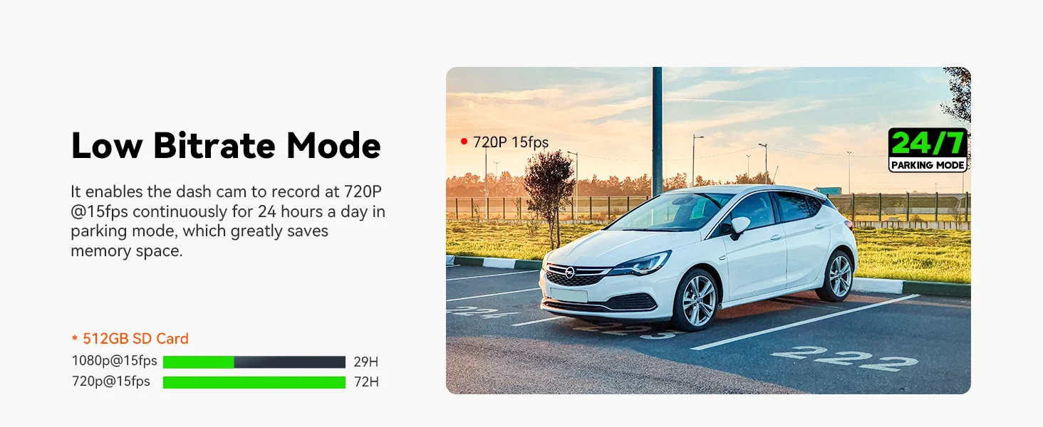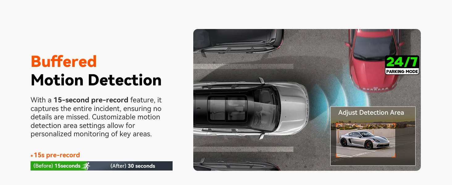 [24/7 Parking Mode] The dash cam provides 24/7 protection with a 15-second pre-recording feature, capturing every detail of an incident. Customizable motion detection areas let you monitor specific zones, while collision detection automatically triggers recording during impacts. Its low frame rate and bitrate mode enable continuous recording while conserving memory. For complete functionality, a hardwire kit is required, ensuring your vehicle is safeguarded even when parked.