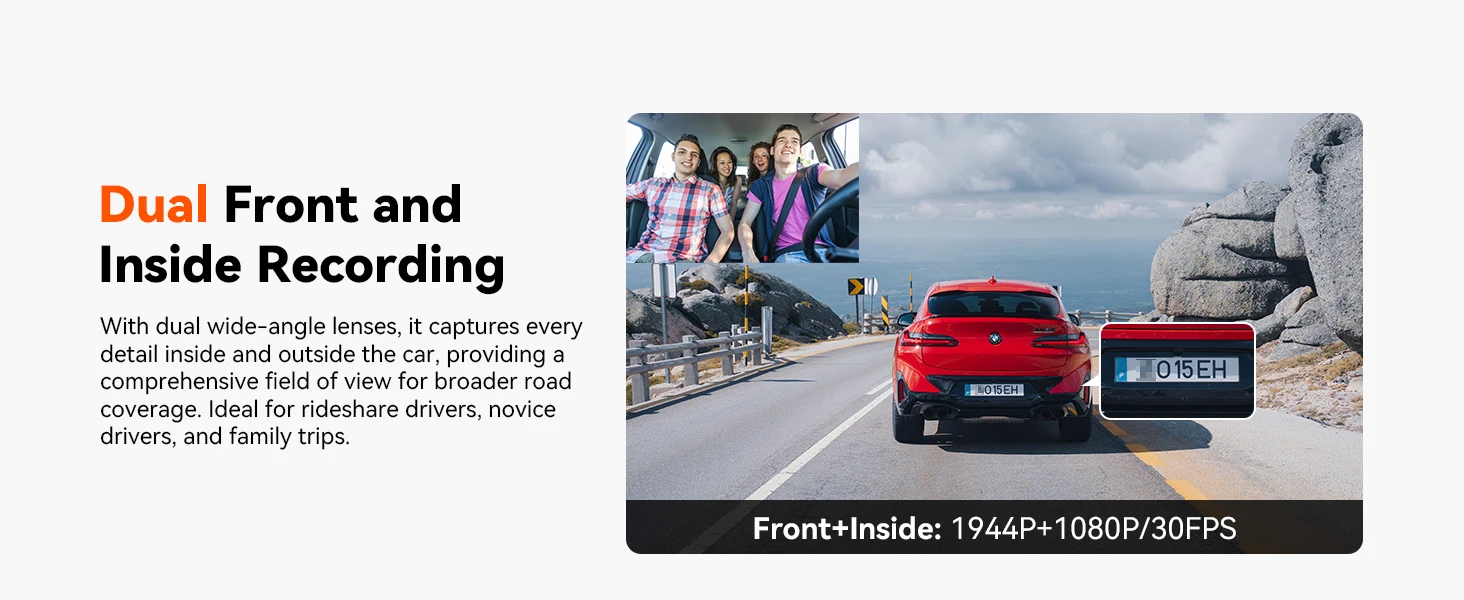 [Front and Inside Dual Recording] The dual dash cam delivers superior video quality with 1944p+ 1080p/30fps, ensuring every detail is captured. Its wide-angle lenses offer a 158° view for the front and a 160° view for the interior, providing maximum security by covering all angles. The front camera also supports 1440p @ 60fps for enhanced detail and clarity. For privacy, you can disable the interior camera and audio. Ideal for rideshare, Uber, Lyft, taxi, and delivery drivers, and family trips.