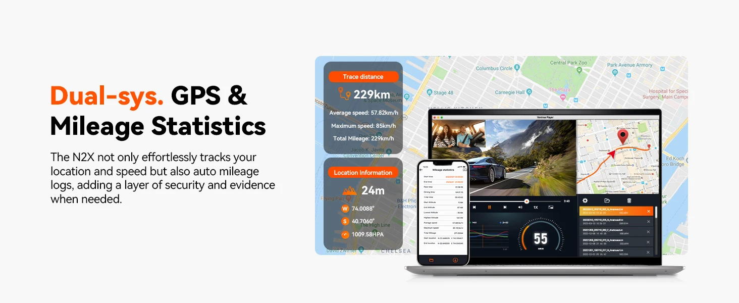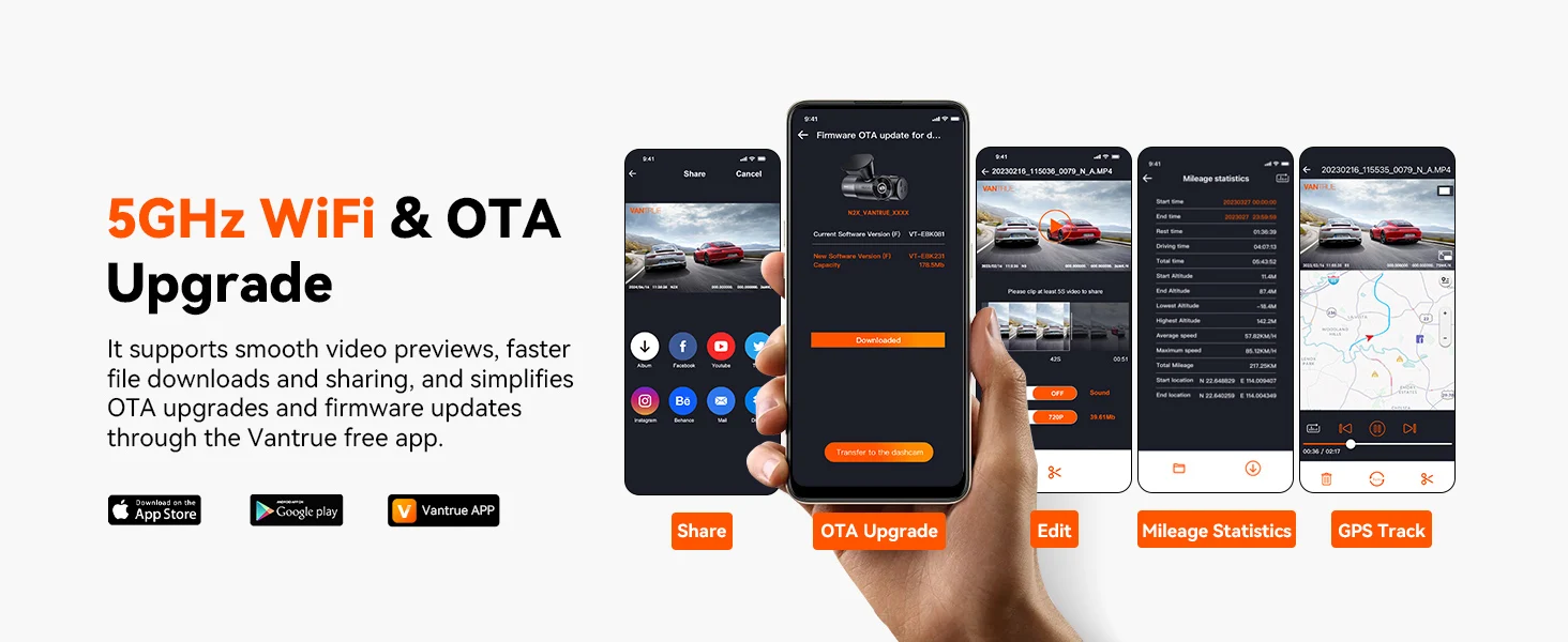 [Faster 5G WiFi & GPS Tracking] The built-in 5G WiFi allows seamless instant previewing, editing, and downloading of videos directly through the free Vantrue app, enhancing convenience while driving. The integrated GPS logger captures time, date, location, and speed, allowing you to track mileage, customize statistical periods, and generate detailed driving reports. This precise GPS data is invaluable for accident investigations or scenic road trips.