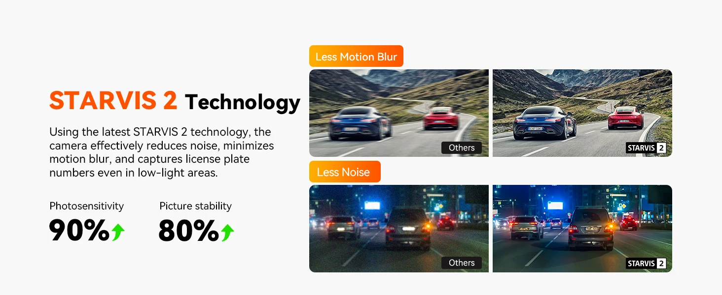 [Dual HDR and IR Night Vision] This 2 channel dash cam is equipped with the latest Sony STARVIS 2 technology, offering outstanding video quality even in low-light conditions. Dual HDR technology intelligently balances light levels to deliver detailed footage. The cabin camera features four IR LED lights, enabling it to capture clear images in complete darkness. Its 45° rotatable lens provides flexible angle adjustments for optimal interior recording. Perfect for late-night drivers.