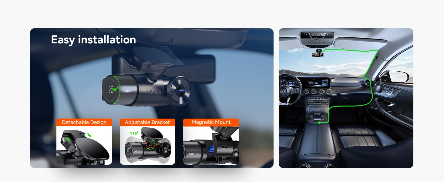 [Easy Installation and Quick Dismounting] The front and cabin dash cam offers a hassle-free setup without professional assistance. Its adjustable magnetic mount features a compact ball joint for easy positioning and a removable pad for flexibility. It supports up to 512GB of external memory (SD card sold separately; recommended Vantrue SD card), ensuring ample storage for any journey.